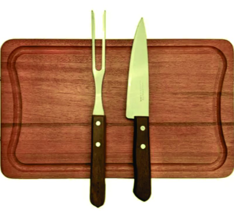 Fabricado em madeira de reflorestamento com acabamento em óleo mineral atóxico antimicrobinao e antibacteriano. Lâmina faca e garfo em aço inox com cabo de madeira de Guarajuba. Pegadores em alumínio.